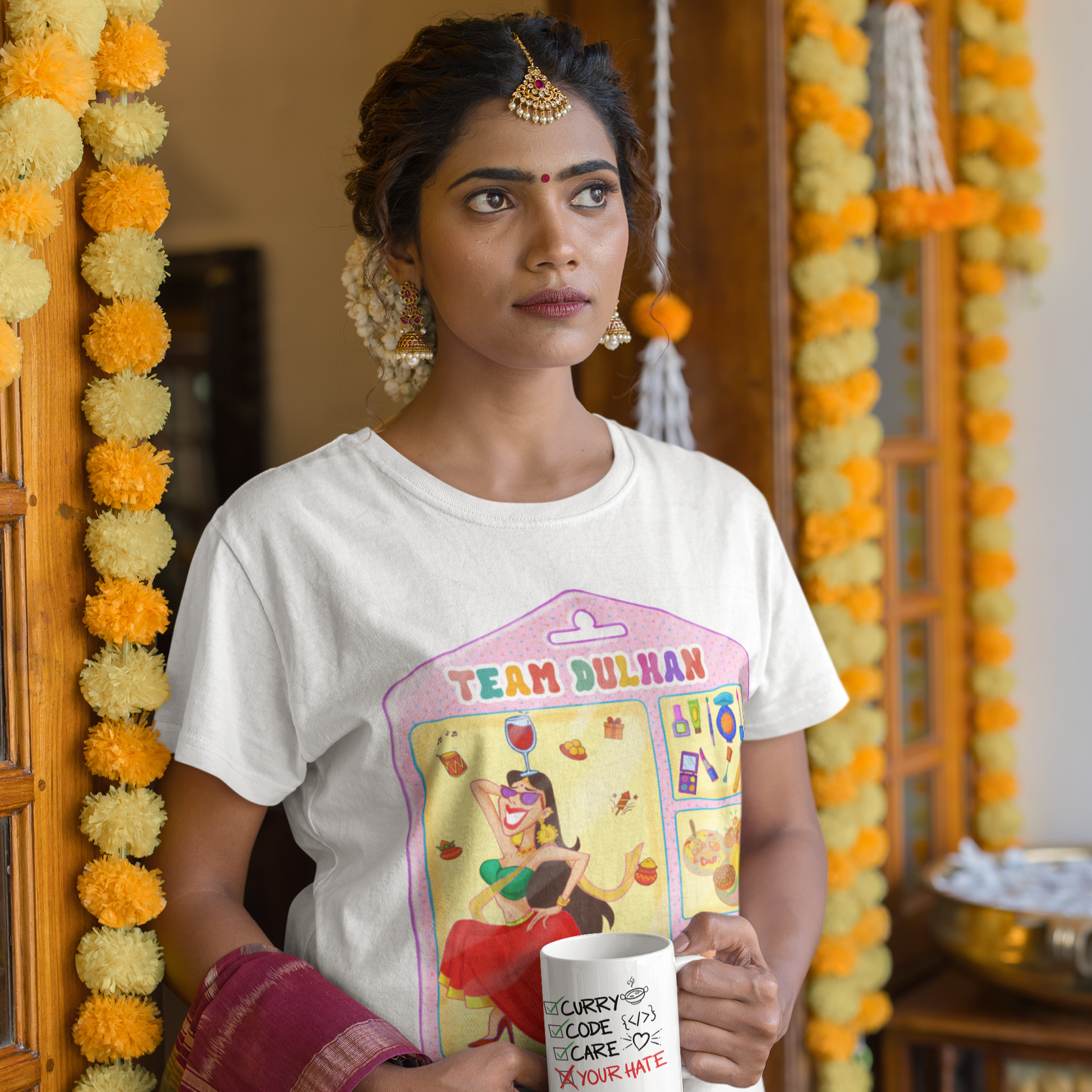 Get your shaadi squad together with our Team Dulhan t-shirt – perfect for bridesmaids, cousins, and friends who are here to celebrate the bride in full Bollywood style! Whether it’s the sangeet, mehendi, haldi, or the big day itself, these tees make your bridal crew look coordinated, fun, and totally Insta-ready.