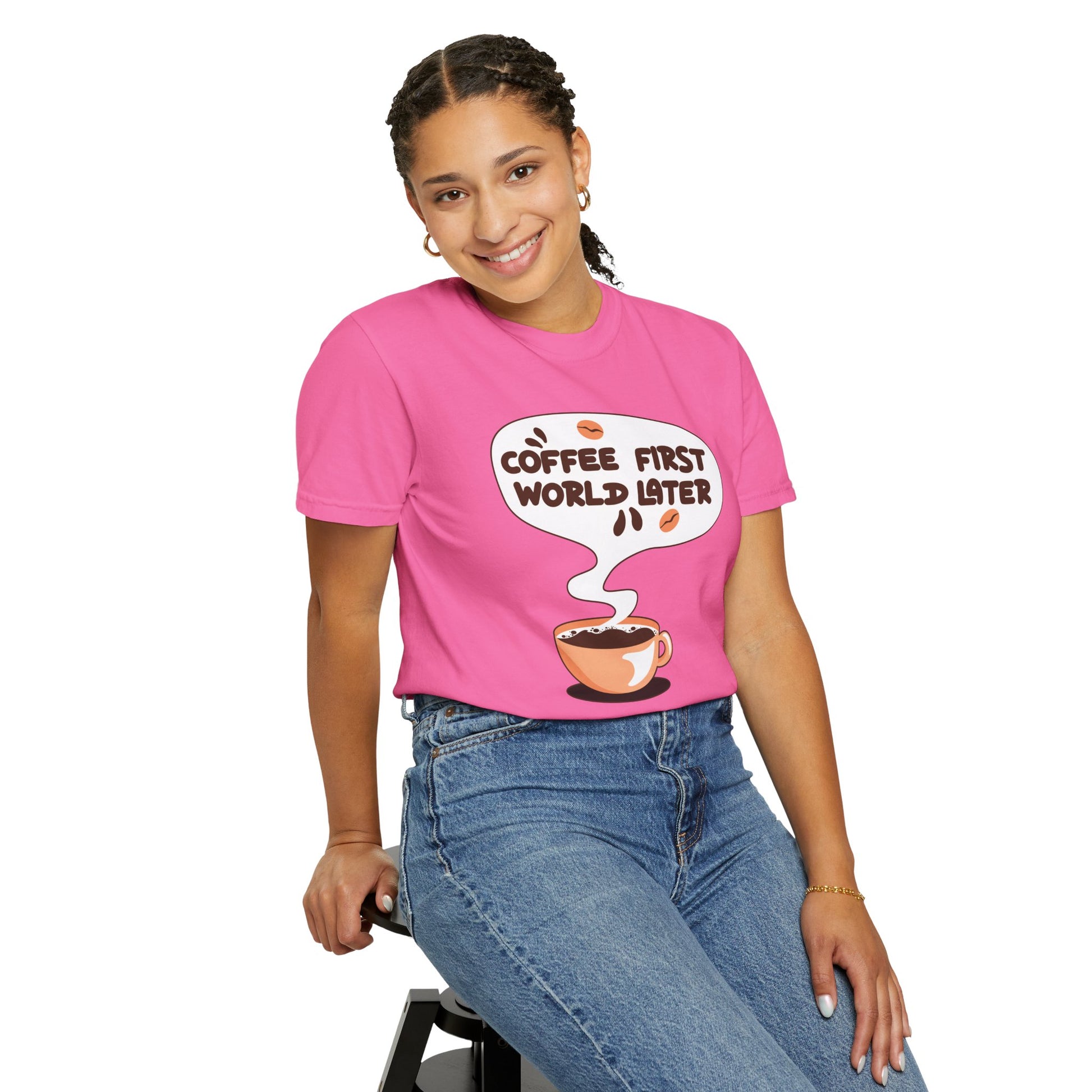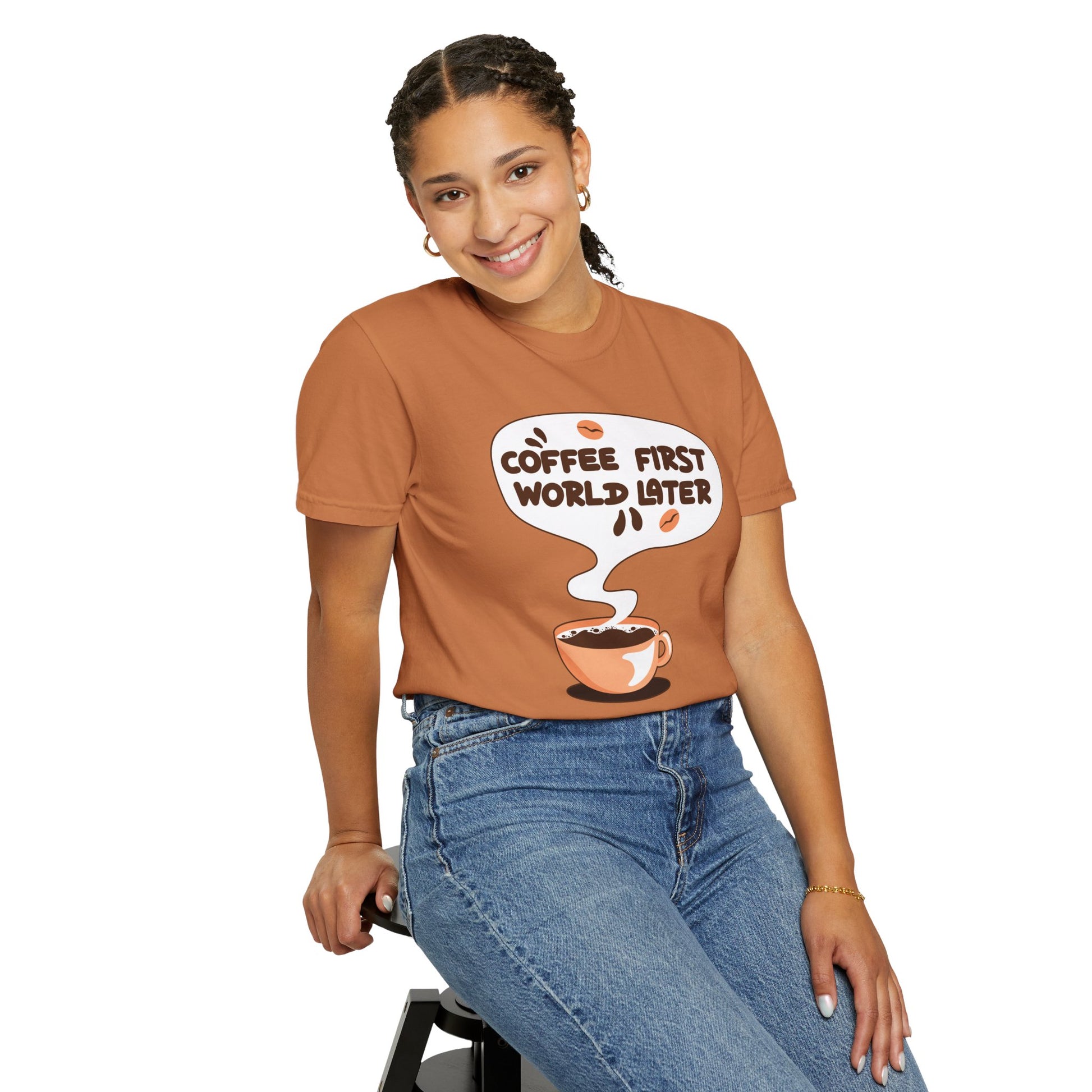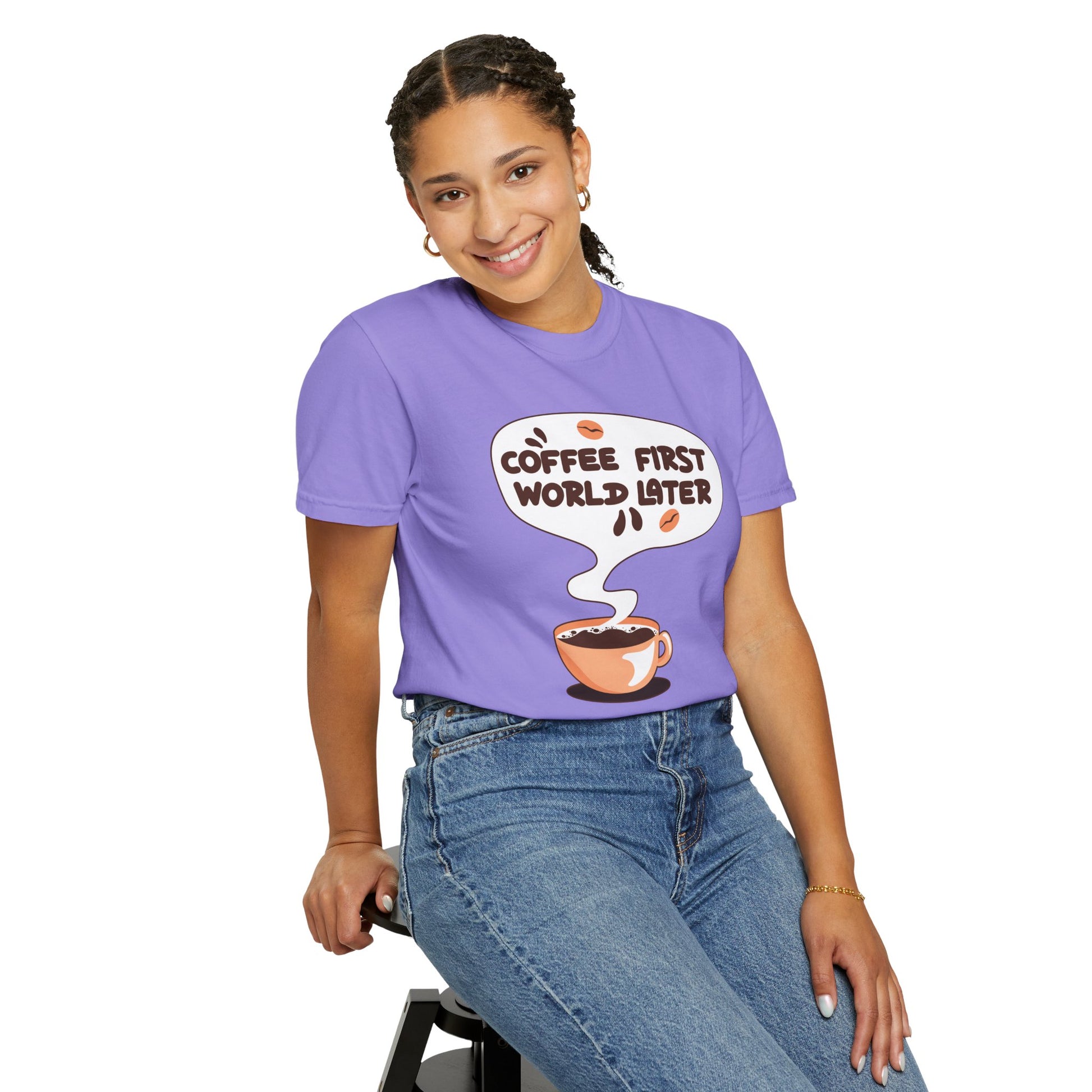 A tee that speaks your mantra—"Coffee First, World Later." Perfect for caffeine lovers who know their priorities!