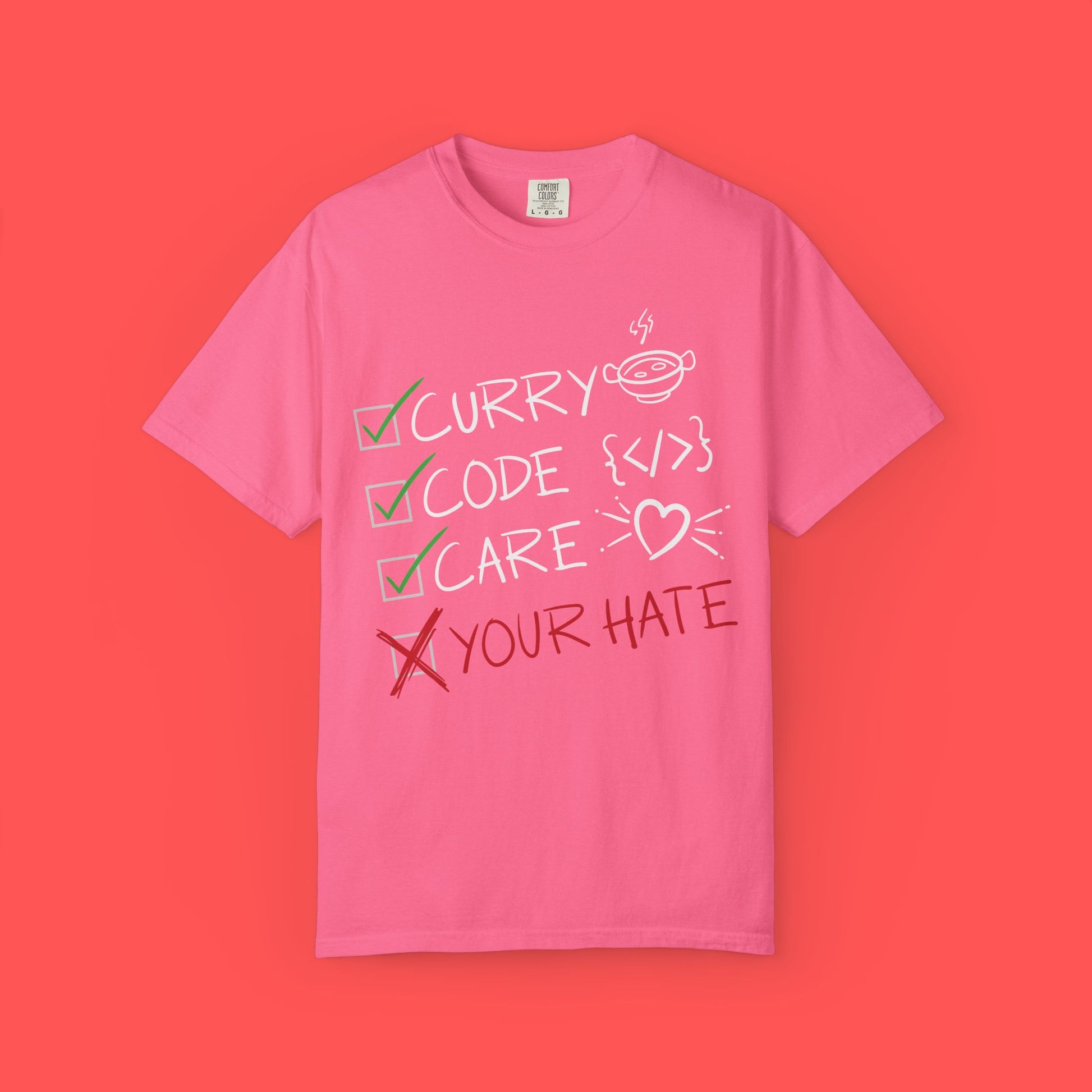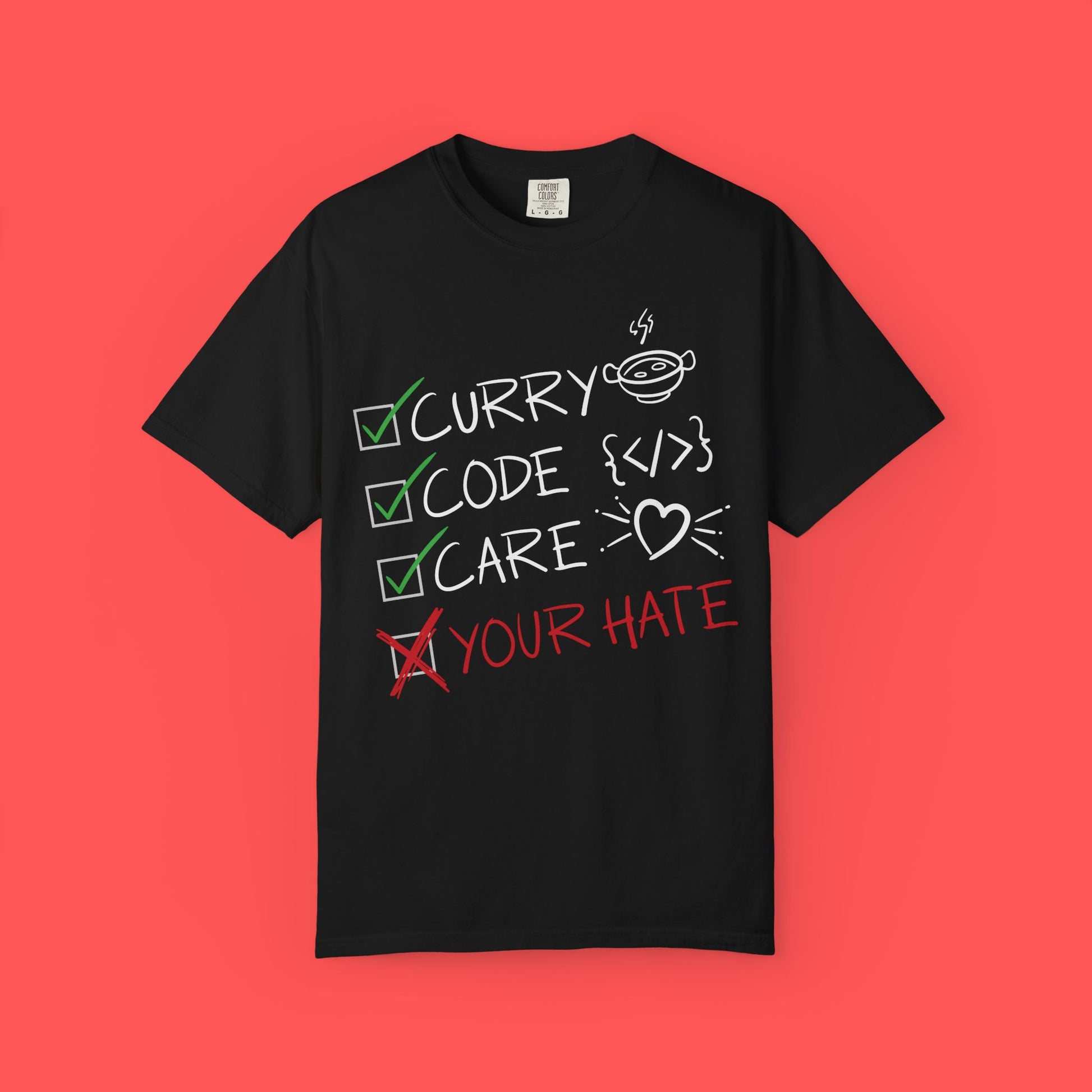 Curry, code, and care—we own it. But your hate? Not today. This tee stands strong against the negativity and celebrates what we bring to the table.