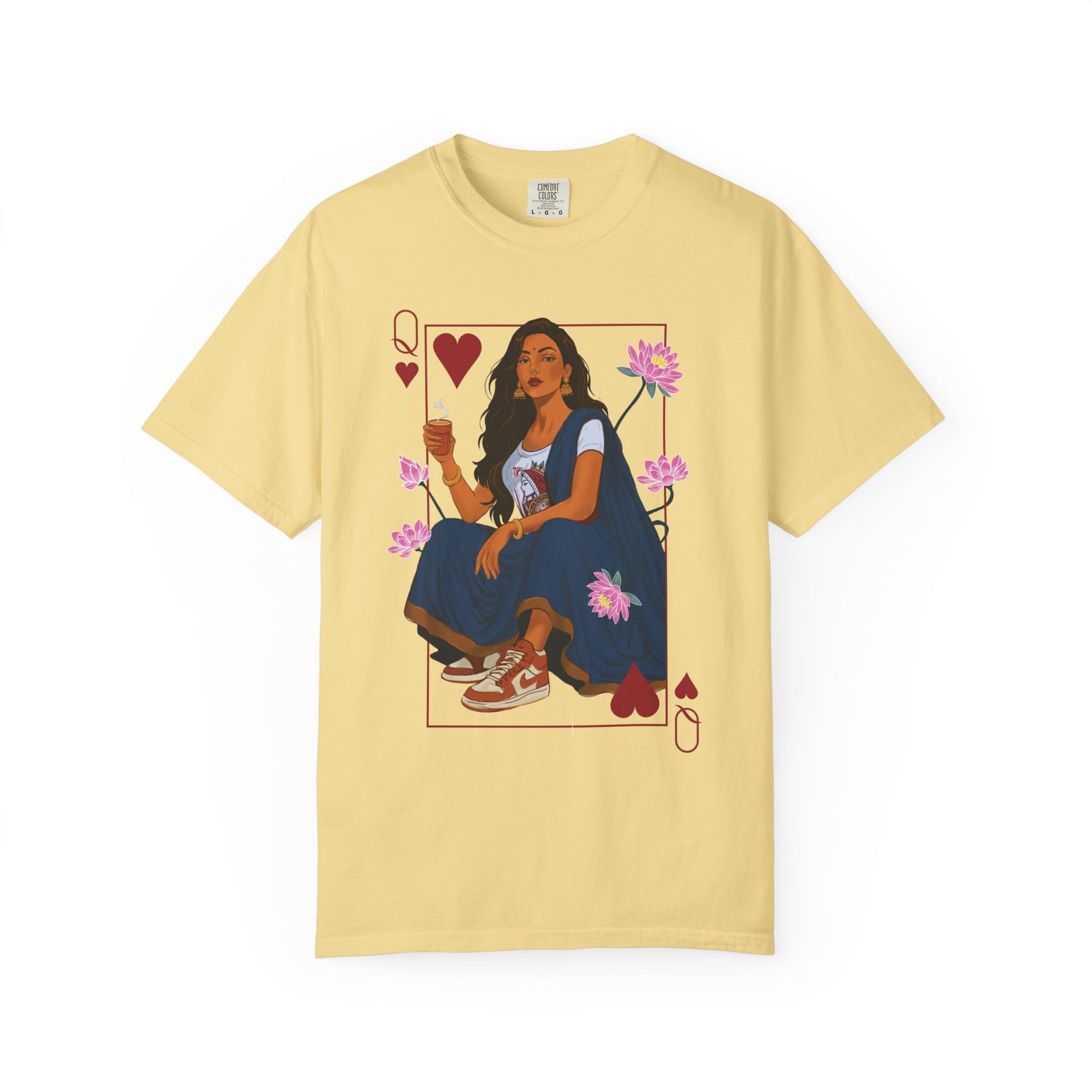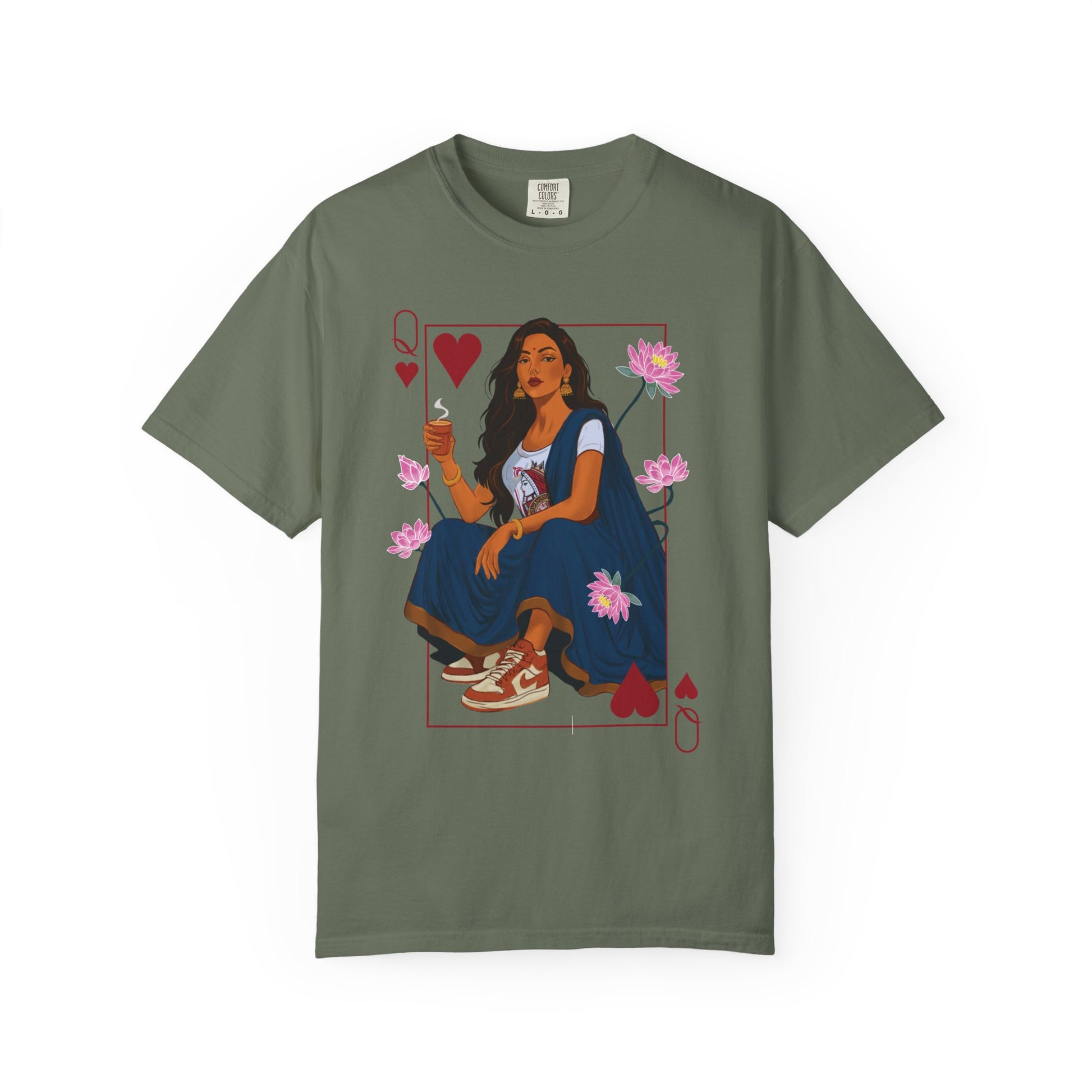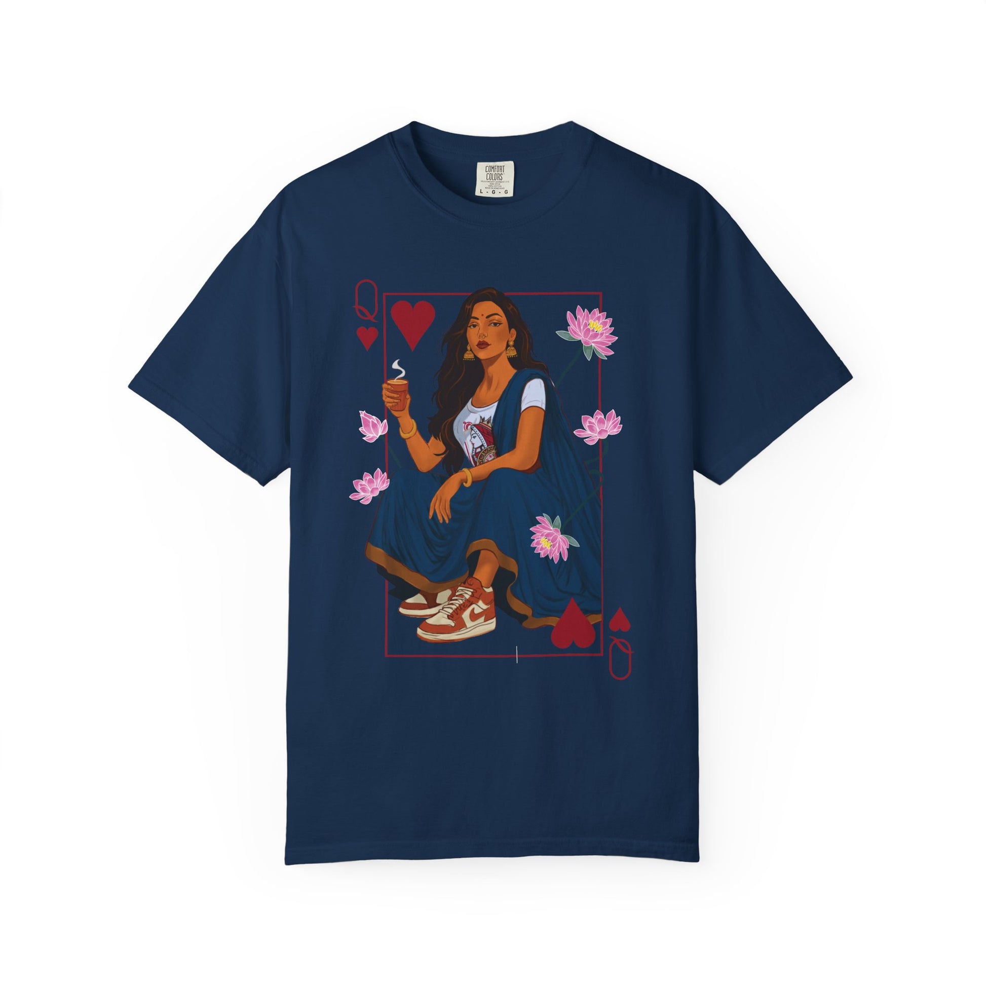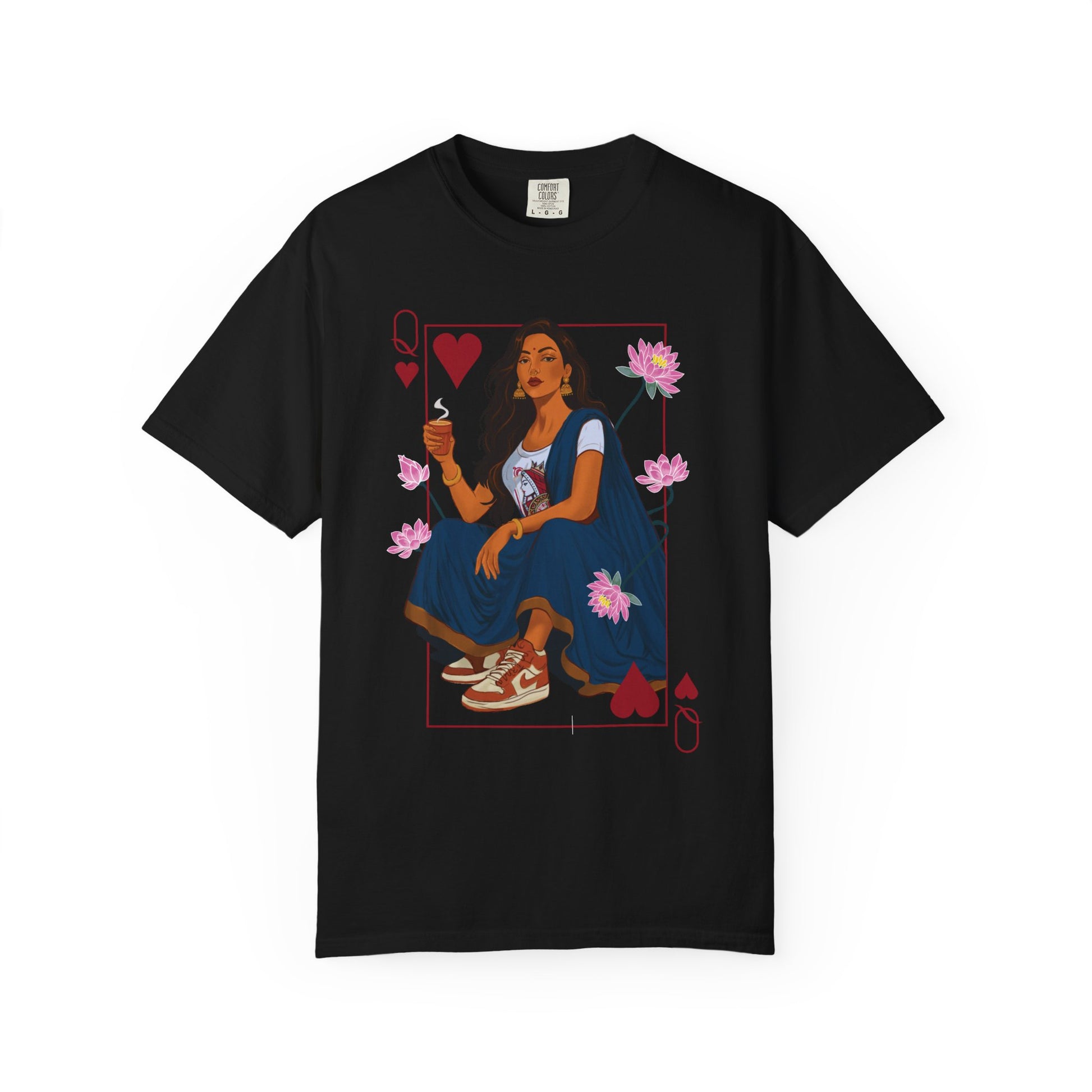 Serve queen energy with a desi twist. This graphic cotton tee celebrates the power, confidence, and effortless swag of a woman who owns every room she walks into. It blends tradition with street style in a way that feels bold, modern, and unapologetically you.