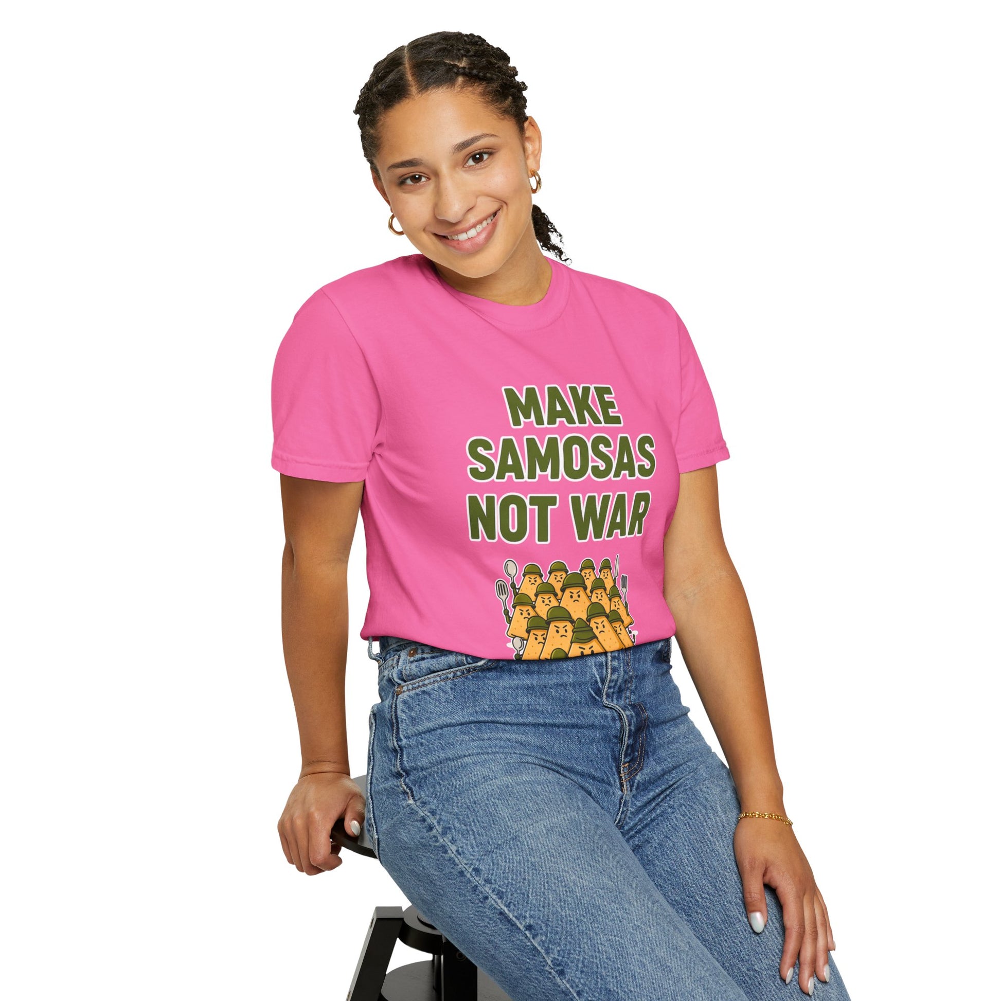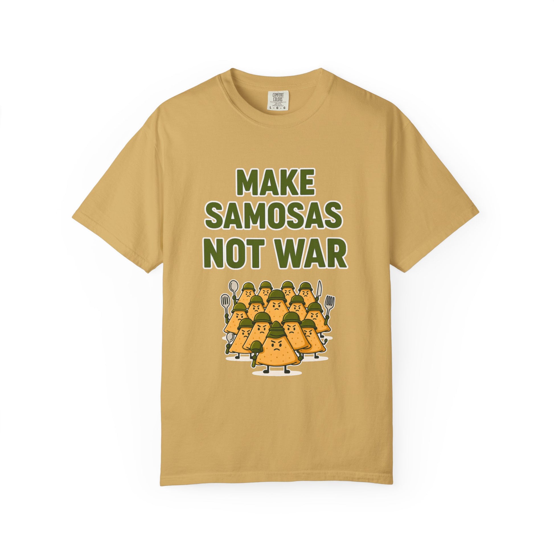 Bring some humor and flavor to the world—wear it, and spread the peace (and the samosas).